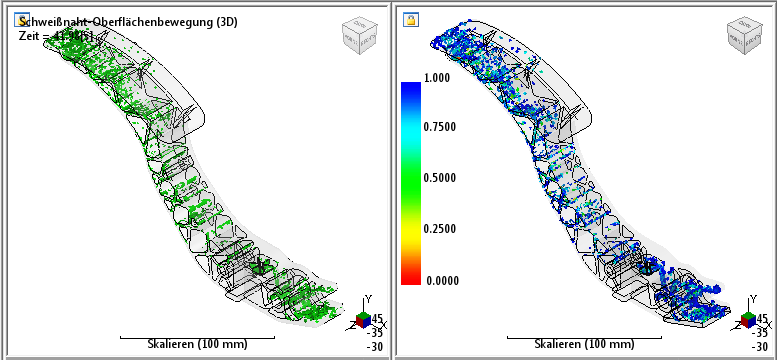 - Wechseln Sie zu der Schweißoberflächenansicht (Start > Ergebnisse anzeigen > Schweißoberflächen), um zu sehen, wie die Schweißnahtoberflächen dem Strukturmodell zugeordnet wurden.
