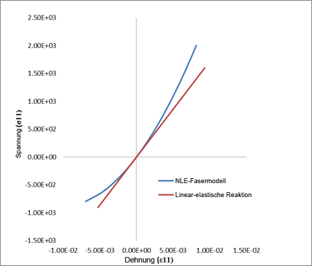 Die Abbildung unten zeigt einen Vergleich zwischen der längsseitigen Spannungs-/Dehnungsreaktion unter Verwendung des Modells in Gleichung 28 für den Druck und die Zugkraft.
