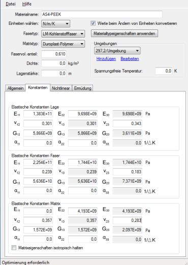 Um mit dem Optimierungsprozess zu beginnen, öffnen Sie Composite Material Manager und spezifizieren Sie ein unidirektionales Material (Datei > Neu > Unidirektional).