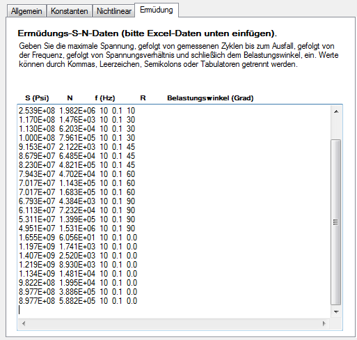 Wechseln Sie zur Registerkarte "Ermüdungsberechnung" innerhalb der Benutzeroberfläche, und geben Sie die S-N-Daten wie unten gezeigt ein. Sie können die Werte aus den zuvor bereitgestellten S-N Tabellen kopieren und hier einfügen.