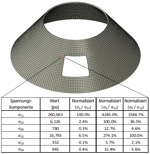 Die folgende Abbildung zeigt den Spannungszustand für einen Punkt in der Außenflächenschicht in der Nähe der oberen linken Ecke der Zugangstür des Verbundkegels. Das Ausfallkriterium für die Faserkonstituente ist abhängig von drei Spannungskomponenten (σ11, σ12, σ13). Die weitere Untersuchung zeigt, dass die Scherspannung (σ13) zu vernachlässigen ist im Vergleich zu den Spannungen in der Ebene (z. B. σ13 ist nur 0.1 % von σ11). Dies weist darauf hin, dass Querspannungen keinen wichtigen Beitrag zum Faserversagen leisten. Auf der anderen Seite wird das Matrixkonstituentenversagen von allen sechs Spannungskomponenten gesteuert. Indem man die Größe der Spannungen außerhalb der Ebene (σ33, σ13, σ23) mit der Größe der Spannungen in der Ebene (σ22, σ12) vergleicht, kann man erkennen, dass die Spannungen außerhalb der Ebene erheblich zum Matrixausfallkriterium beitragen. Um ein Versagen der Struktur präzise vorhersagen zu können, muss der Matrixausfall ordnungsgemäß erfasst werden. Denn nach einem Matrixausfallereignis wird die Matrixkonstituentensteifheit reduziert und die Spannungsumverteilung bewirkt eine höhere Spannung in den Fasern.