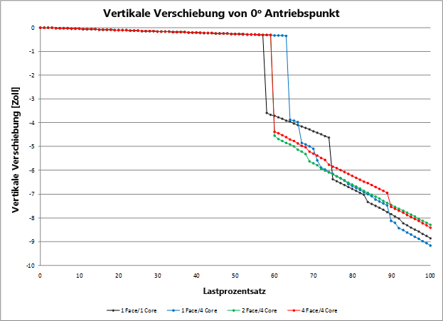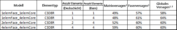 Bei schrittweiser Erhöhung der Elementeanzahl über die Dicke der Lage verringert sich die Querschersteifheit des Modells schneller als die Steifheit in der Ebene des Modells. Aus diesem Grund tendiert das Modell bei zunehmender Gesamtdicken-Netzdichte zu einer Erhöhung der Querscherverformung auf Kosten der Verformung in der Ebene. Das Endergebnis dieses Trends ist, dass die Größenordnung der maximalen Spannungen in der Ebene tendenziell abnimmt, wenn die Gesamtdicken-Netzdichte erhöht wird. Folglich wird das Auftreten von lokalisierten Ausfällen bei höheren Lastniveaus prognostiziert.
