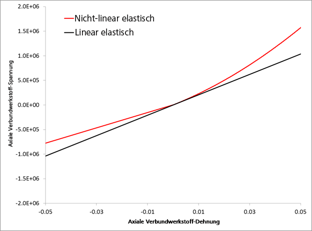 Das Fasermodul wird als nichtlinear angesehen, bis ein Faserversagen auftritt. Nachdem ein Faserversagen aufgetreten ist, bleiben die Verbundwerkstoffsteifheiten unverändert, da deren Einfluss vernachlässigbar ist und eine Aktualisierung der Eigenschaften eine ineffiziente Inanspruchnahme der Rechenleistung wäre.
