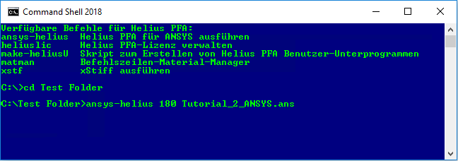 Eine Stapeldatei mit dem Namen ansys-helius.bat, die zusammen mit Helius PFA installiert wird, erleichtert das Senden von Jobs an Helius PFA. Diese Datei befindet sich im Ordner "bin" im Helius PFA-Verzeichnis auf Ihrem Computer. Die Verwendung dieser Stapeldatei wird im Folgenden gezeigt: