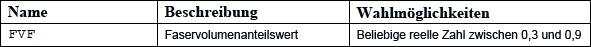 Das Schlüsselwort *FVF ist ein untergeordnetes Element von *MATERIAL und muss vorhanden sein. Dieses Schlüsselwort liefert Informationen zum Faservolumenanteil. Bei unidirektionalen Materialien repräsentiert FVF den gesamten Faservolumenanteil für den Verbundwerkstoff. Bei gewebten Materialien gibt FVF den Garn-Faservolumenanteil an.