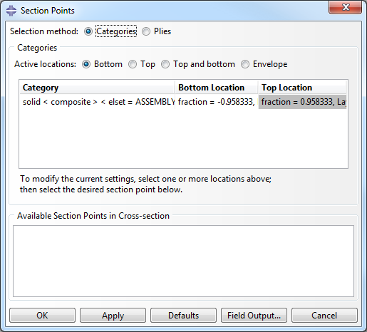 Beim Anzeigen der Ergebnisse der Finite-Element-Lösung für laminierte Verbundstrukturen müssen Sie die Nummerierung der Schnittpunkte durch die Dicke von mehrschichtigen Elementen beachten. Ein Konturendiagramm verwendet nur die Werte der Variablen, die an einem bestimmten Abschnittspunkt gespeichert ist. Wenn Sie ein Konturendiagramm für eine bestimmte Materialschicht anzeigen, müssen Sie daher einen Abschnittspunkt auswählen, der sich innerhalb dieser Materialschicht befindet. Um einen bestimmen Abschnittspunkt auszuwählen, rufen Sie das Dialogfeld "Abschnittspunkte" auf, indem Sie auf der Hauptwerkzeugleiste auswählen. Das Dialogfeld "Abschnittspunkte" ist unten dargestellt. Der von Abaqus/Viewer im Diagramm dargestellte Vorgabeabschnittspunkt ist der untere Abschnittspunkt (d. h. der Abschnittspunkt an der Unterseite des Elements). Um Ergebnisse für eine bestimmte Materiallage anzuzeigen, aktivieren Sie die Option "Lagen" und wählen Sie die entsprechende Lage aus. Wählen Sie die Option "Hülle" aus, um Ergebnisse für alle Abschnittspunkte im selben Diagramm anzuzeigen. Hüllendiagramme stellen den maximalen absoluten, maximalen oder minimalen Wert der ausgewählten Variable für alle Lagen in einem Layup dar.