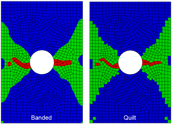 Die folgende Abbildung zeigt zwei verschiedene Konturendiagramme der Ganzzahlvariable SDV1 für eine axial belastete Verbundplatte mit einer zentralen Bohrung. Die Verwendung von drei einzelnen Farben erleichtert die Identifizierung der Bereiche, in denen die einzelnen Verbundschadenszustände auftreten. Die blauen Elemente (SDV1 = 1) sind völlig unbeschädigt. Die grünen Elemente (SDV1 = 2) weisen ausgefallene Matrixkonstituenten sowie unbeschädigte Fasern auf. Die roten Elemente (SDV1 = 3) weisen ausgefallene Matrixkonstituenten und ausgefallene Faserkonstituenten auf. Beachten Sie, dass das Flächenverbund-Konturendiagramm den durchschnittlichen SDV1-Wert für jedes einzelne Element angibt, während das Bandkonturendiagramm einfach die SDV1-Werte an den einzelnen Integrationspunkten verwendet, um die Farbkonturen unabhängig von den Elementbegrenzungen zu erstellen.