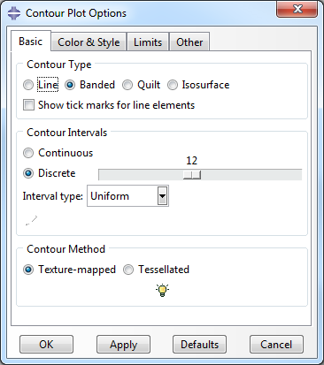 Da SDV1 eine diskrete reelle Variable ist, die Werte zwischen 1.0 und 4.0 annehmen kann, ist es wichtig, die Einstellungen von Abaqus/Viewer so zu ändern, dass jedem einzelnen Ganzzahlwert von SDV1 eine eindeutige Farbkontur zugeordnet wird. In Fällen, in denen SDV1 die Werte 1.0, 2.0 oder 3.0 annehmen kann, legen Sie die Anzahl der Farbkonturen auf 3 fest. Die Anzahl der in einem Konturendiagramm verwendeten Konturintervalle kann im Dialogfeld "Konturendiagrammoptionen" angegeben werden, das Sie aufrufen können, indem Sie auf der Hauptwerkzeugleiste auf klicken. Das Dialogfeld "Konturendiagrammoptionen" ist unten dargestellt. Wählen Sie unter der Überschrift "Konturintervalle" die Option "Diskret" aus und verwenden Sie die Schiebereglerleiste, um die Anzahl der einzelnen Farbkonturen auszuwählen, die der Anzahl der Ganzzahlwerte entspricht, die SDV1 annehmen kann.
