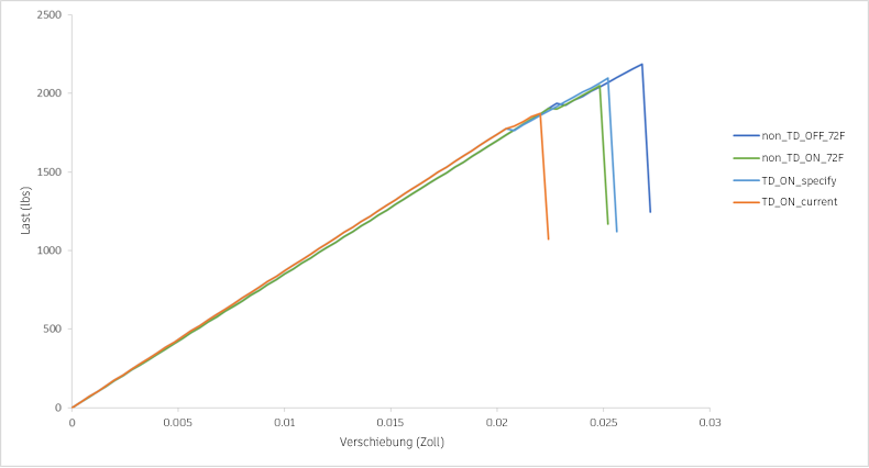 Alle Modelle verfügen über ähnliche Steifigkeitswerte, wobei die beiden temperaturabhängigen Modelle (TD_ON_specify und TD_ON_current) eine etwas höhere Steifigkeit aufweisen. Die beiden Modelle weisen eine geringfügig höhere Steifigkeit auf, da sich die gemessenen Werte E11 und E22 von 72 °F auf 260 °F erhöhen, und diese Modelle verwenden Eigenschaften bei 140 °F, während die anderen Modelle Eigenschaften bei 72 °F verwenden.