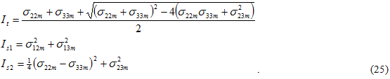 Es ist nicht ratsam, ein Kriterium mit zehn Koeffizienten auf ein gewebtes Verbundmatrixmaterial mit nicht optimal charakterisierten Festigkeiten anzuwenden. Aus diesem Grund enthält das Matrixausfallkriterium für gewebte Verbundwerkstoffe nur drei einstellbare Parameter, die direkt mithilfe der drei gemessenen Kniestärken des gewebten Materials angepasst werden. Wie bei den unidirektionalen Verbundwerkstoffen werden unveränderliche Größen verwendet. Wählen Sie als Invarianten It, Is1 und IS2; sie beschreiben die normale maximale Zugspannung für die Faserrichtung, die maximale Längsscherspannung bzw. die maximale Querscherspannung. Das Kriterium ist einfach eine quadratische Kombination dieser Invarianten.