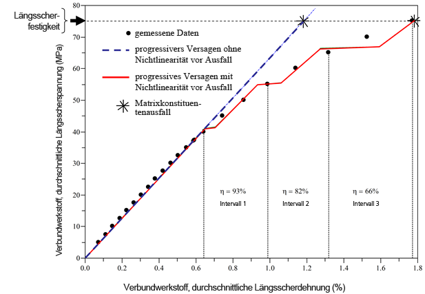 ), die direkt zu drei aufeinanderfolgenden diskreten Reduktionen in der Längsschersteifheit des Verbundmaterials führen (
