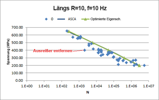 - Experimentelle Ermüdungsdaten enthalten eine große Streuung, und ein Optimierungsschema, das die optimalen Materialkonstanten für eine Ermüdungsanalyse liefert, gewichtet jeden Datenpunkt gleich. Sie sollten die Ausreißer aus den Daten, die zur Optimierung der Ermüdungseigenschaften verwendet werden, entfernen. Dadurch wird verhindert, dass unwahrscheinliche S-N-Datenpunkte in die Berechnung von optimierten Eigenschaften miteinbezogen werden.
