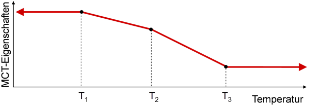 Die Abbildung unten zeigt ein Beispiel für eine MCT-Charakterisierung unter Verwendung von Verbundmaterialdaten, die für drei separate Temperaturen T1 < T2 < T3 erfasst wurden. Die vertikale Achse mit der Beschriftung "MCT Properties" könnte eine beliebige Verbund- oder Konstituenteneigenschaft (z. B. Module, Poissonzahlen, Koeffizienten der thermischen Ausdehnung, Festigkeiten usw.) repräsentieren. Wenn das Verbundmaterial bei Temperatur T betrachtet wird und T zwischen T1 und T3 liegt, werden die Verbund- und Konstituenteneigenschaften linear aus den verfügbaren Daten interpoliert. Wenn das Verbundmaterial bei Temperatur T betrachtet wird und T kleiner als T1 oder größer als T3 ist, werden einfach die Verbund- und Konstituenteneigenschaften der nächstliegenden charakterisierten Temperatur (in diesem Fall T1 oder T3) verwendet.