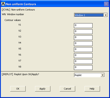 Da SVAR1 eine Ganzzahlvariable ist, die nur eine begrenzte Anzahl von Werten (z. B. 1,2,3) annehmen kann, ist es wichtig, dass Sie die Einstellungen von ANSYS ändern, sodass jedem Ganzzahlwert von SVAR1 eine eindeutige Farbkontur zugeordnet wird. In Fällen, in denen SVAR1 die Werte 1, 2 oder 3 annehmen kann, sollten Sie die Anzahl der Farbkonturen auf 3 setzen. Die Anzahl der in einem Konturendiagramm verwendeten Konturenintervalle kann im Dialogfeld "Non-uniform Contours" angegeben werden, das Sie aufrufen können, indem Sie auf der Hauptwerkzeugleiste auf . Das Dialogfeld "Non-uniform Contours" ist unten dargestellt. In Fällen, in denen SVAR1 die Werte 1, 2 oder 3 annehmen kann, sollten Sie im Dialogfeld V1=1, V2=2 und V3=3 festlegen. Alternativ kann der /CONTOUR-Befehl verwendet werden, um die Anzahl der Konturen und den Bereich der Konturwerte festzulegen.