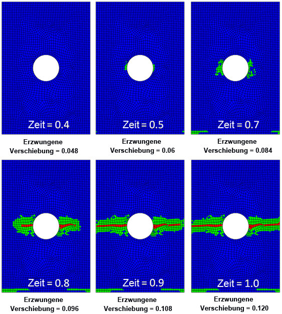 Als Beispiel für die obige Erläuterung betrachten Sie die Abbildung unten, die PLESOL-Konturendiagramme von SVAR1 = 1,2,3 zu mehreren Zeitpunkten während einer progressiven Schadensanalyse zeigt. Die Verbundplatte hat acht Materiallagen und ist auf Spannung belastet. Der Einfachheit halber wird nur die dritte Lage angezeigt. In diesen Diagrammen steht die Farbe Blau für die Integrationspunkte ohne Ausfall, die Farbe Grün für die Integrationspunkte mit Matrixausfall und die Farbe Rot, um die Integrationspunkte mit Faserausfall darzustellen.