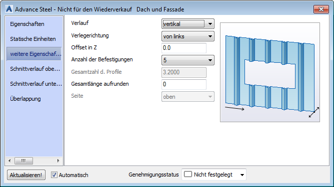 | Verlegerichtung | Hier wählen Sie die Verlegerichtung der Fassade. Von oben oder Von unten (für horizontale Fassaden) bzw. Von links oder Von rechts (für vertikale Fassaden). |