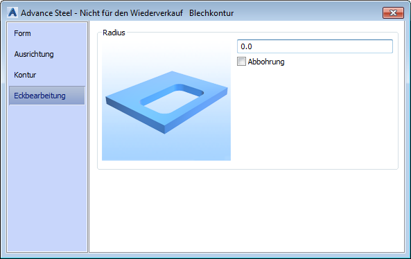 In diesem Abschnitt wird die Bearbeitung der Eigenschaften von Blechkonturen über die dafür vorgesehenen Registerkarten im Dialogfeld Konturverarbeitung beschrieben.