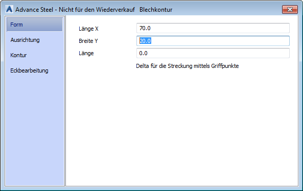 | Breite X | Definiert die Länge der Kontur entlang dem ersten ausgewählten Rand des Blechs. |