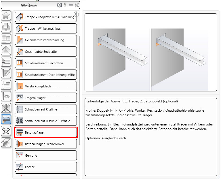 Der Anschluss Betonauflager Blech-Winkel kann nur zwischen bestimmten Typen von Betonelementen (Wand, Decke, Träger) und einigen der Stahlprofile (I, T, C, L, geschweißt, zusammengesetzt oder mit Entformungsschräge) verwendet werden.