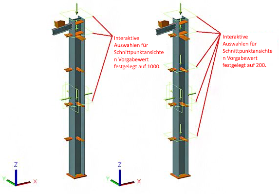 Für Schnittansichten hängt die Anzahl der im Modell angezeigten interaktiven Auswahlmöglichkeiten außerdem vom Wert der Vorgabe Minimaler Abstand für automatische Detailschnitte ab. Dieser Parameter befindet sich in der Kategorie Einstellungen\Vorgaben\Zeichnung-Allgemein aus den Management Tools.