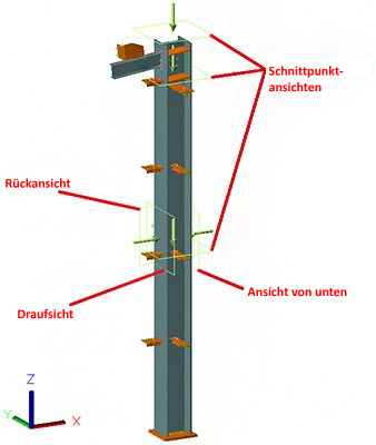 Wird der Wert dieser Vorgabe geändert, ändert sich auch die Anzahl der von Advance Steel gefundenen Schnitte. Im folgenden Beispiel wurde der Vorgabewert für Minimaler Abstand für automatische Detailschnitte von 1.000 auf 200 reduziert und es wurden fünf interaktive Ansichten gefunden, während mit dem ursprünglichen Vorgabewert nur drei Ansichten gefunden wurden.