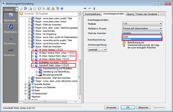 Die Option immer/interaktiv befindet sich in jeder Ansicht auf der Registerkarte Ansichtseigenschaften. Die Namen der Ansichten, die auf interaktiven Modus eingestellt sind, enthalten normalerweise das Wort „Wahl“ oder „Auswahl“, die Zeichnungsstile den Ausdruck „Wahl der Ansichten“.