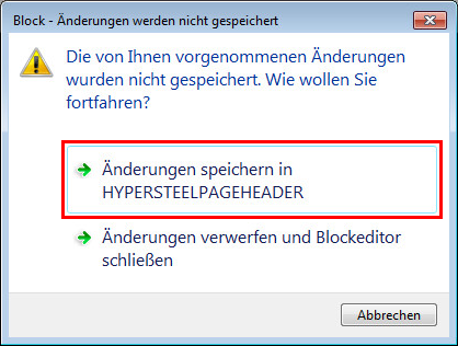 - Klicken Sie auf Blockeditor schließen und wählen Sie Änderungen speichern in HYPERSTEELPAGEHEADER.