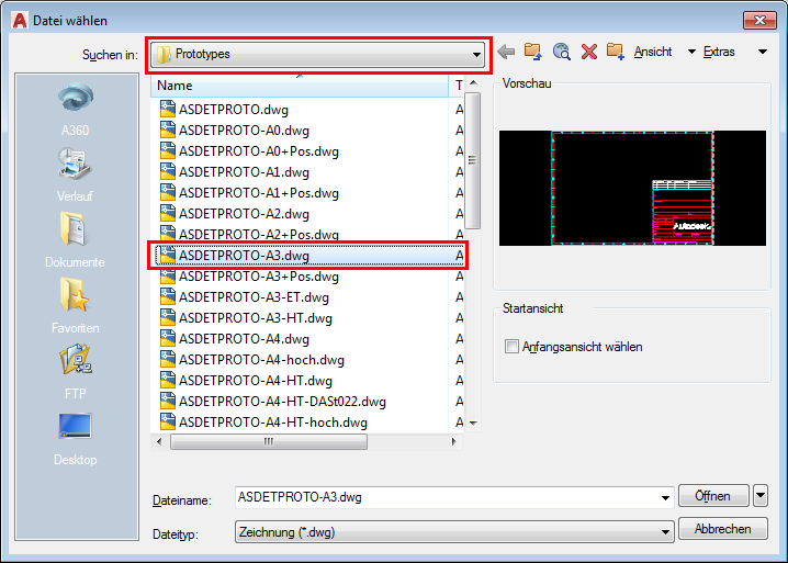 - Wählen Sie die gewünschte Prototyp-Datei, z. B. ASDETPROTO-ANSI-E.dwg.