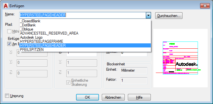 - Wählen Sie im Dialogfeld Einfügen die Option HYPERSTEELPAGEHEADER in der Dropdown-Liste Name aus und klicken Sie auf OK.
