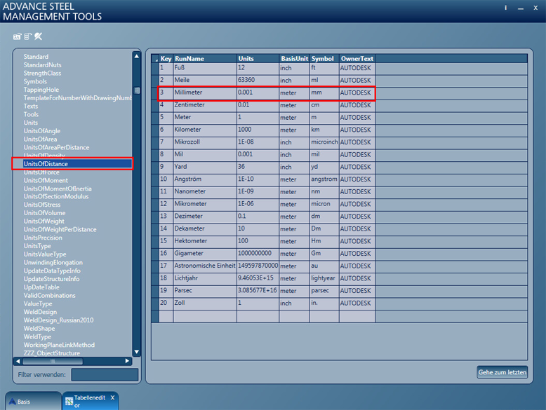 Die erste Zahl ist der Einheitenschlüssel aus den Tabellen in der Datenbank AstorBase, beginnend mit UnitsOf... (z. B. für eine Entfernung wäre es von UnitsOfDistance). Die zweite Zahl ist der Einheitentyp aus der Tabelle UnitsType in der Datenbank AstorBase. Die dritte Zahl ist die Einheitengenauigkeit aus der Tabelle UnitsPrecision in der Datenbank AstorBase. Im obigen Beispiel haben wir [3,3,1] verwendet, das heißt: Schlüssel 3 aus der Datenbank AstorBase, Tabelle UnitsOfDistance: Millimeter.