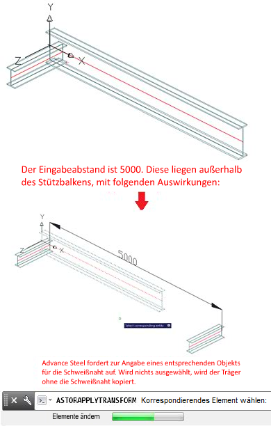 Wenn das Element an der kopierten Position ein anderes verbundenes Objekt in derselben relativen Position vorfindet, kopiert dieses Werkzeug auch die Schweißnaht und nimmt die erforderliche Verbindung vor. Andernfalls werden Sie aufgefordert, ein neues Stützelement für die zu erstellende Schweißnaht einzugeben.