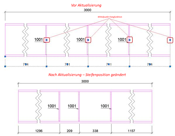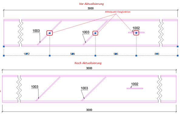 Alle weiteren Mittelfangpunkte für Löcher/Schrauben, die zwischen den Endpunkten gewählt werden (es sei denn, alle werden ausgewählt, siehe folgender Abschnitt), werden während der Aktualisierung entfernt, ohne dass dies sich auf die richtigen Fangpunkte auswirkt.
