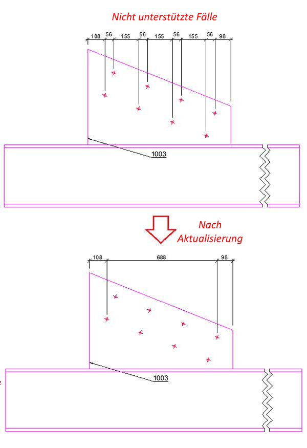 Außerdem muss die Bemaßungsrichtung mit der Richtung des Schrauben-/Lochbilds übereinstimmen. Andernfalls werden die Zwischenpunkte während der Aktualisierung entfernt.