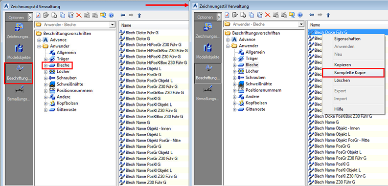 Wenn der Zeichnungsstil so eingestellt werden soll, dass die Anschlussnamen in der Zeichnung erscheinen, muss eine neue Beschriftungsvorschrift erstellt werden. (Wählen Sie dazu in der Zeichnungsstil-Verwaltung die Option Beschriftungsvorschriften). Beispiel: In den meisten Fällen fügt ein Anschluss Bleche als neue Elemente hinzu. Daher ist das Blech das Element, für das Sie eine neue Beschriftungsvorschrift erstellen.