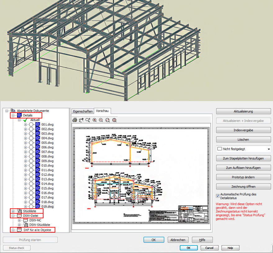 Die abgeleiteten Dokumente sind Details, Stücklisten, NC-, DStV- und DXF-Dateien.