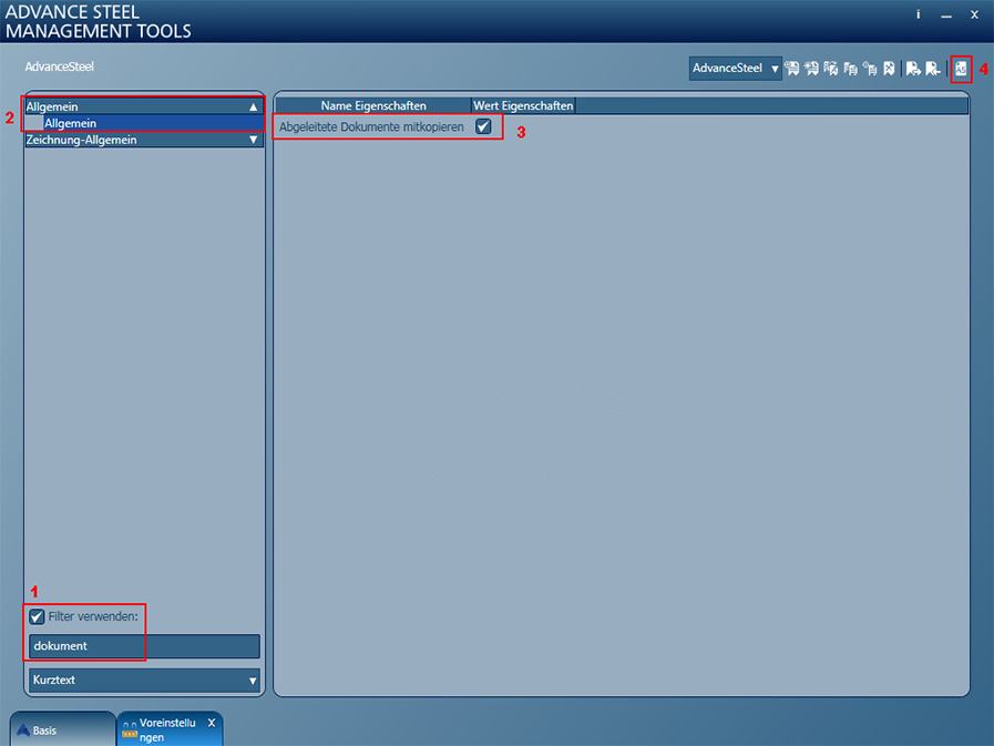 Aktivieren Sie den Filter und schreiben Sie dann "Dokument" in das Filterfeld (1). Öffnen Sie die Kategorie Allgemein (2) und aktivieren Sie die Vorgabe Abgeleitete Dokumente mitkopieren in der Spalte Wert Eigenschaften (3). Nachdem die Vorgabe aktiviert wurde, klicken Sie auf Einstellungen in Advance laden und schließen Sie die Management Tools .