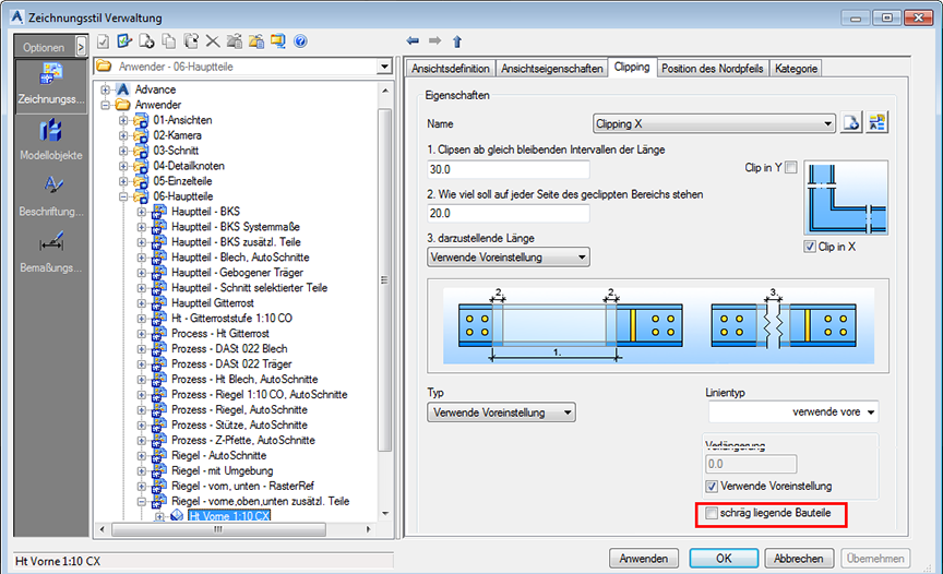 - Deaktivieren Sie auf der Registerkarte Clipping für die Ansicht (z. B. die Vorderansicht) die Option Schräg liegende Bauteile.