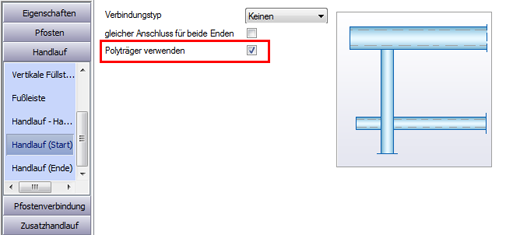 Der Handlauf besteht vorgabegemäß aus einer Reihe von Profilen, die über Schweißnähte verbunden sind. Im Dialogfeld Anschluss können Sie den Handlauf als Polyträger definieren. Wählen Sie hierzu die Option Polyträger verwenden auf der Registerkarte Handlauf (Start)/Handlauf (Ende).