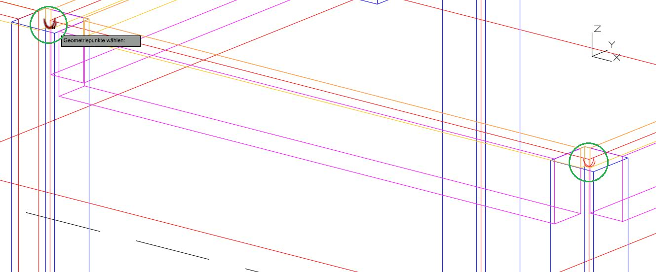 Das obere Ende der Wand wird auf dieselbe Weise mit der Arbeitsebene Ebene 2 verknüpft, wobei Sie dieses Mal jedoch die Punkte am oberen Wandende auswählen. Verknüpfen Sie den Träger auf dieselbe Weise. Dieser wird allerdings nur mit der oberen Arbeitsebene Ebene 2 verbunden.