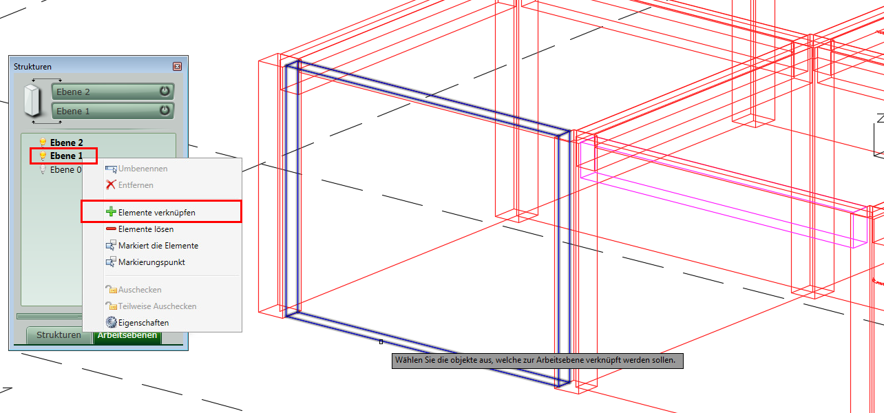 Die Wand und der Träger sind nicht mit Ebene 2 verknüpft. Um Elemente ordnungsgemäß mit der gewünschten Ebene zu verknüpfen, müssen Sie zwei Schritte durchführen: