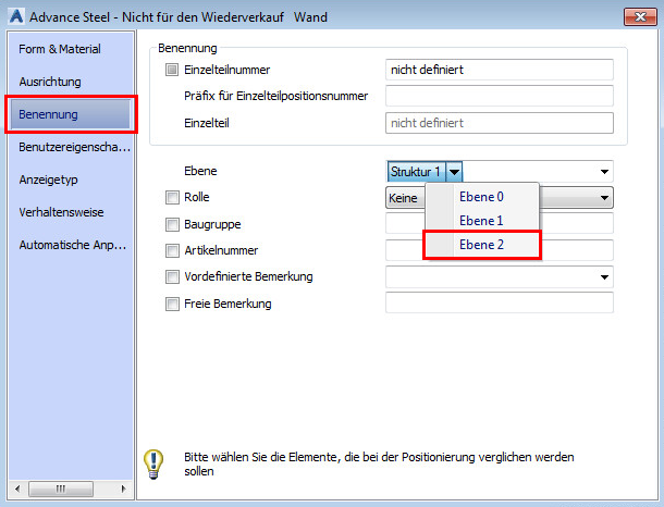 *Um Elemente einer Ebene zuzuweisen, wählen Sie im Dialogfeld Eigenschaften des jeweiligen Elements auf der Registerkarte Benennung im Feld Ebene die gewünschte Ebene aus.