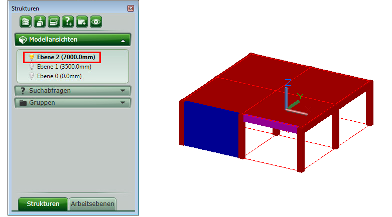 Wenn eine Ebene aktiviert ist, werden die neuen Modellelemente auf den Arbeitsebenen der aktivierten Ebene erstellt.