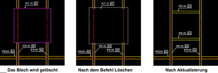 In Advance Steel löschen Sie mit dem Befehl LÖSCHEN ein Element vollständig aus einer Zeichnung. Nachdem Sie den Befehl LÖSCHEN verwendet haben, wird ein graues Feld angezeigt, um den Benutzer darauf hinzuweisen, dass die Zeichnung aktualisiert werden muss.