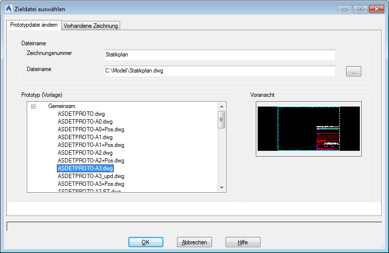 - Nach Auswahl des Zeichnungsstils wird das Fenster Zieldatei auswählen geöffnet. Benennen Sie Ihre Zeichnung, wählen Sie einen Prototyp und klicken Sie auf OK.