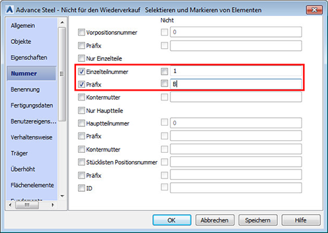 - Registerkarte Nummer: Wählen Sie Einzelteilnummer und geben Sie 1 ein; wählen Sie Präfix und geben Sie B ein.