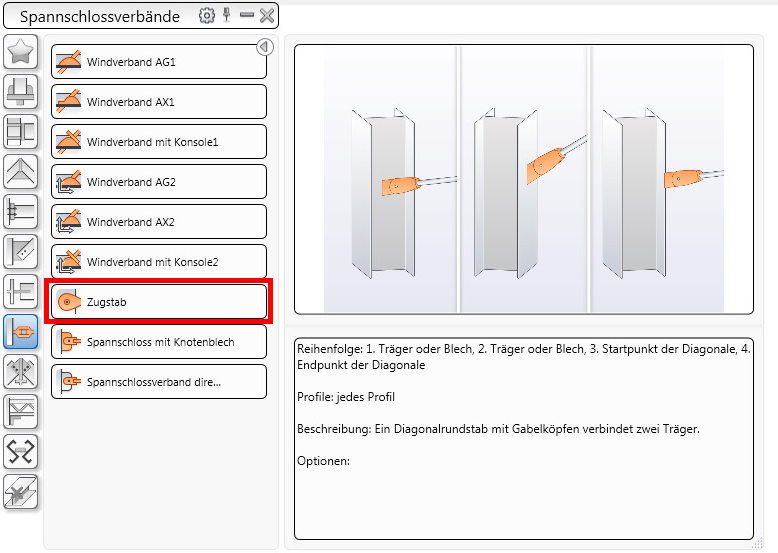 Die Anschlüsse Zugstab oder Verband mit Stabanker stehen im Verbindungs-Manager zur Verfügung.