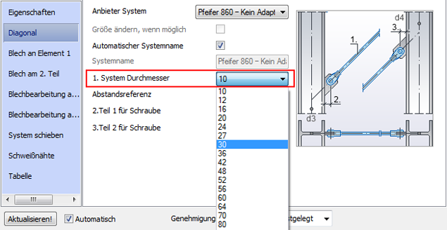 Wenn der Benutzer den Anschluss an Trägern erstellt, kann der Systemdurchmesser in den Optionen für den Anschluss gewählt werden.