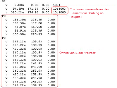 In der NC-Datei werden Scribing-Informationen entweder im PU-Block (Pulver) oder im KO-Block (Körner) angezeigt, je nachdem, welcher dieser Blöcke in der Vorgabe Kontur als KO- oder PU-Block festgelegt wurde. Der Unterschied zwischen den Blocknamen wird von der NC-Maschine erkannt, da die Informationen innerhalb des Blocks in beiden Fällen identisch sind.