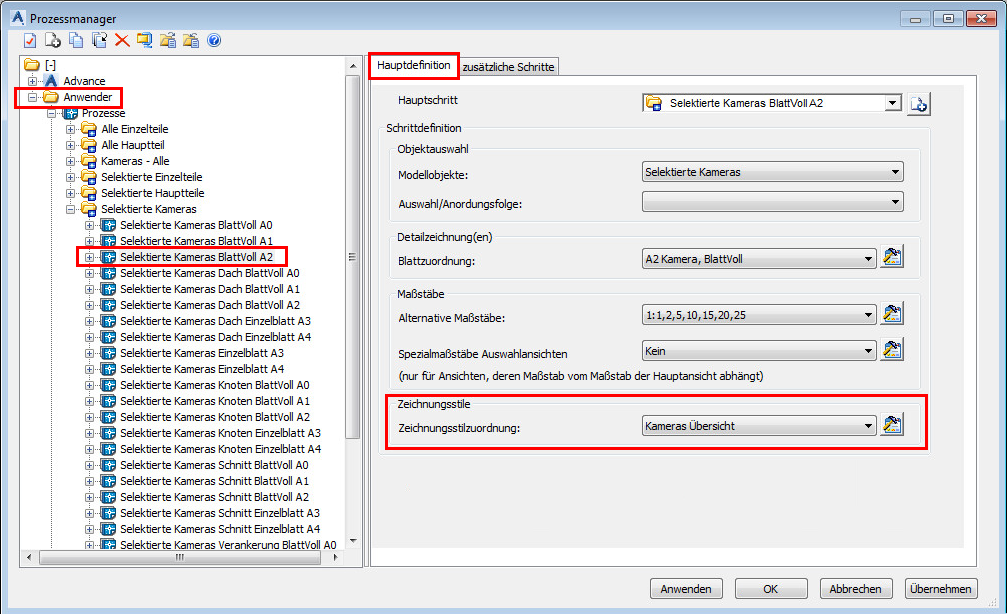 - Wechseln Sie im Fenster Prozessmanager zu Anwender > Prozesse > Kameras > Selected Cameras PageFull ANSI-E. Wählen Sie auf der Registerkarte Hauptdefinition > Abschnitt Zeichnungsstile die Option Kameras aus der Dropdown-Liste.