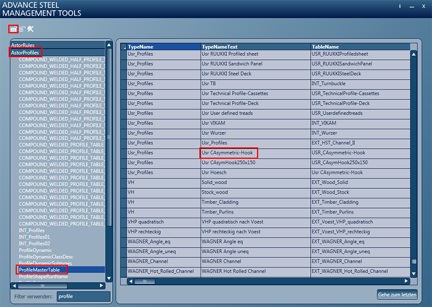 - Suchen Sie in der Datenbank AstorRules mithilfe des Filters nach der Tabelle RULE_StairStringerUserSections.